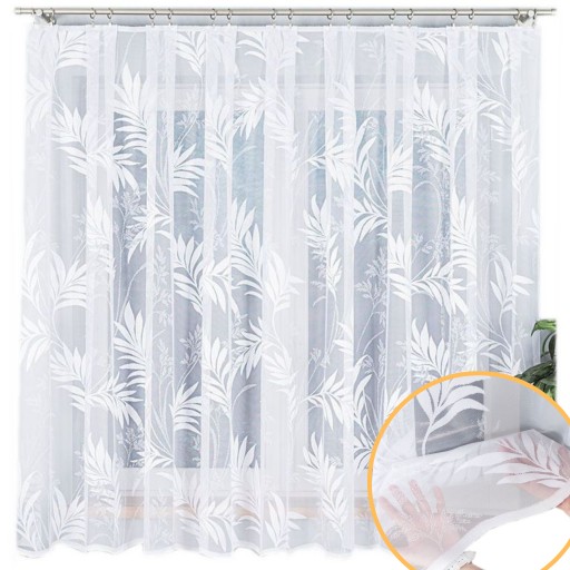 Przedmiotem aukcji jest firanka żakardowa sprzedawana na metry o wysokości 160 cm w śnieżnobiałym kolorze ze wzorem po całości w liście palmy. Firanka ta dobrze przepuszcza światło. Firany żakardowe po praniu nie wymagają prasowana.