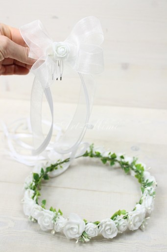 Dodatkowo tył wianuszka posiada odczepianą szyfonową kokardkę z różyczka zamocowaną na grzebyku.