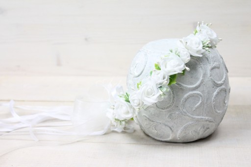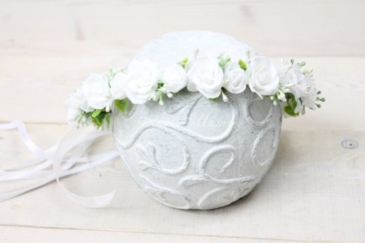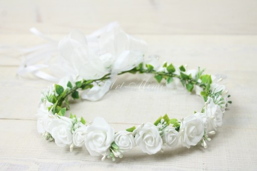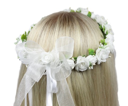 Wyjątkowo piękny wianek komunijny, pełen śnieżno białych różyczek, zdobiony listkami bluszczu które swoim kształtem przypominają serduszka, pręcikami perłowych perełek oraz dekoracyjną trawą.