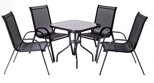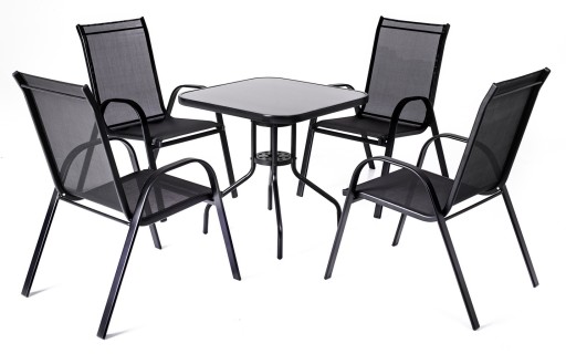 ZESTAW MEBLI OGRODOWYCH idealny do Twojego ogrodu. Stelaż został podwójnie lakierowany proszkowo, co idealnie przystosowuje ten produkt to zastosowania wewnątrz jak i na zewnątrz. Siedzisko krzesła oraz oparcie zostało zrobione z czarnego, elastycznego obicia tekstylnego tak, aby maksymalnie zwiększyć wygodę. Posiada ono dwa oparcia boczne. Użyte materiały nie wymagają częstej konserwacji, są odporne na warunki pogodowe i nie wymagają specjalnych środków do pielęgnacji. Nóżki są dodatkowo zaopatrzone w nakładki z tworzywa sztucznego. Stół posiada blat z czarnej hartowanej szyby o gr. 5 mm.