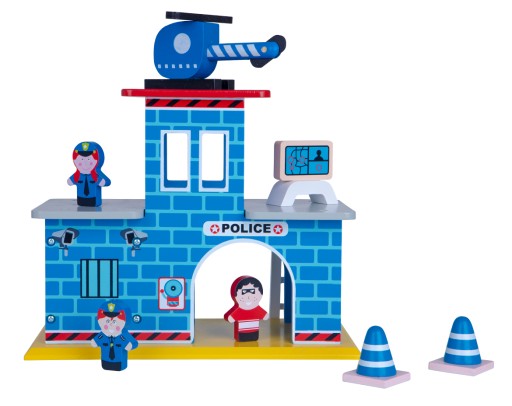 Wyjątkowy, wykonany z drewna posterunek, doskonały na wielogodzinną zabawę w gronie małych stróżów prawa.