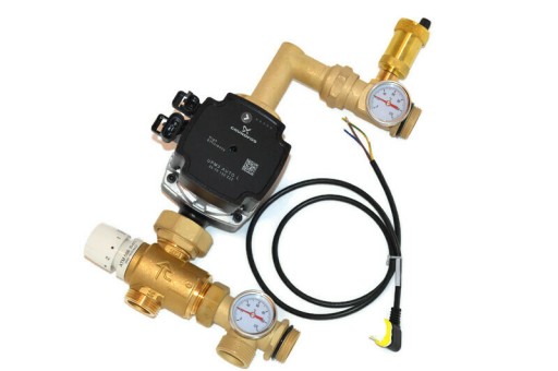Zestaw mieszający rozdzielacza mosiężnego 9 sekcje polskiego producenta (atest) w gatunku CW617N (woda pitna) z wysokiej jakości pompą energooszczędną firmy GRUNDFOS UPM3 AUTO L 25-70