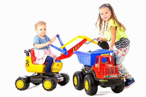 Sterowanie odbywa się przy pomocy dwóch dźwigni- jedna odpowiada za pracę łyżki, druga za sterowanie ramieniem. Dodatkowe wyposażenie to blokada ramienia powodująca jego unieruchomienie w pozycji podniesionej. Wygodne i duże siedzenie zapewnia stabilną pozycję dziecka. Oparcie dla nóg stanowią antypoślizgowe podnóżki. Dodatkowo dziecko może stopami przesuwać koła powodując przemieszczanie w czasie zabawy. W podstawie znajduje się praktyczny schowek na drobiazgi. Duża podstawa zabawki i szeroko rozstawione koła zapewniają dużą stabilizację w trakcie zabawy. Uchwyt siedziska usprawnia wygodne przenoszenie koparki. Poprzez obsługę dziecko rozwija swoje zdolności manualne, poprawia koncentrację i rozwija wyobraźnię i organizację. Zabawka idealnie spisuje się warunkach domowych – można np. używać jej do nakładania klocków – ale prawdziwa zabawa zaczyna się w piaskownicy, gdzie w pełni można wykorzystać jej możliwości. Idealne dopełnienie do kompletu stanowi wywrotka.