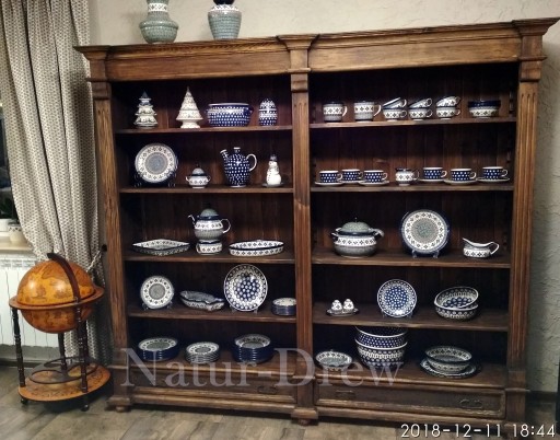 - Drewniany Regał na książki,postarzany z piękną zdobioną koroną u góry,regał posiada trzy regulowane półki,które ułatwiają dopasowanie u dołu posiada drewniane funkcjonalne szuflady wysuwane na drewnianych prowadnicach,dodatkowym atutem regału są ręcznie kute zawiasy i uchwyty które nadają charakteru i duszy meblom z tej serii.
