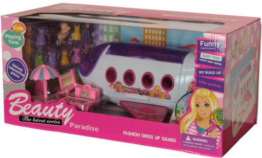 Zabawka samolot z otwieranym środkiem, z dużą ilością gadżetów : 2 lalki, 6 sukienek, 2 fryzury, stolik z parasolem+2 krzesła,leżak, grill walizka.
