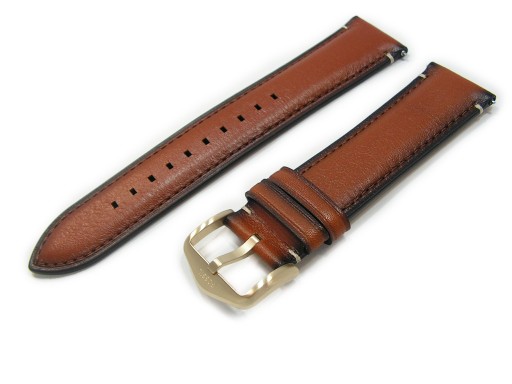 Oryginalny pasek do zegarka marki Fossil Grant do modelu FS5268, wykonany ze skóry naturalnej w kolorze średni brąz, boki paska ciemniejsze, przeszyty, gładki, sprzączka wykonana ze stali nierdzewnej w kolorze złotym z napisem Fossil.