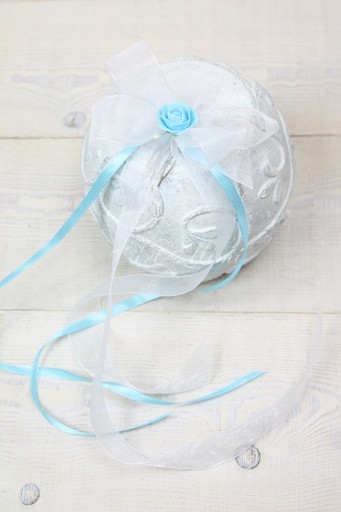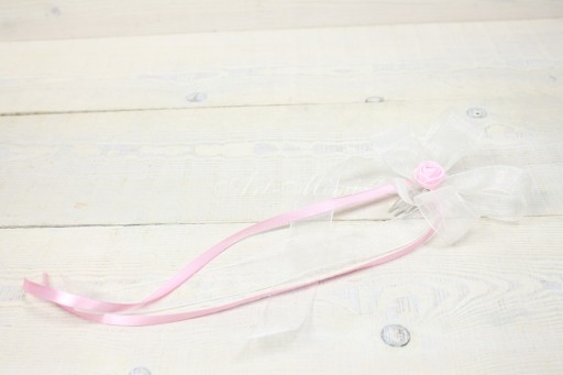 Wykonana z szerokiej tasiemki szyfonowej w kolorze białym, oraz dwóch cieńszych tasiemek satynowych w wybranym kolorze