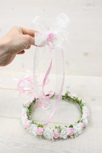 Kokarda szyfonowa z różą na grzebyku dodatkowa ozdoba do wpięcia w wianek komunijny.