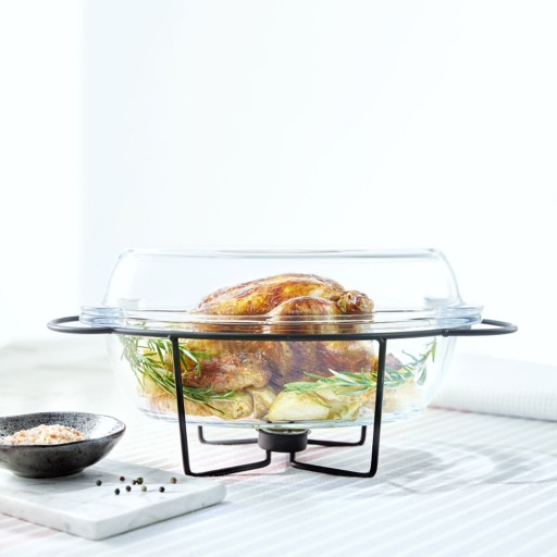 Naczynia z linii Saule umożliwiają zarówno przygotowanie pysznego dania, jak i długotrwałe podtrzymywanie temperatury serwowanego posiłku. Produkt świetnie sprawdza się podczas kolacji świątecznej czy też innych przyjęć okolicznościowych. Naczynie wykonane jest z najwyższej jakości szkła, które dodatkowo charakteryzuje się eleganckim, ponadczasowym wyglądem i prostym designem. Naczynia (bez stelaża) można używać w temperaturach od -40°C do +300°C, dlatego idealnie sprawdzą się do przechowywania dań w lodówce oraz do używania w piekarniku. Dodatkowo, naczynie (bez stelaża) jest przystosowane do mycia w zmywarce. Naczynie z bardzo stylowym czarnym stelażem wpisuje się idealnie w najnowsze trendy wnętrzarskie.
