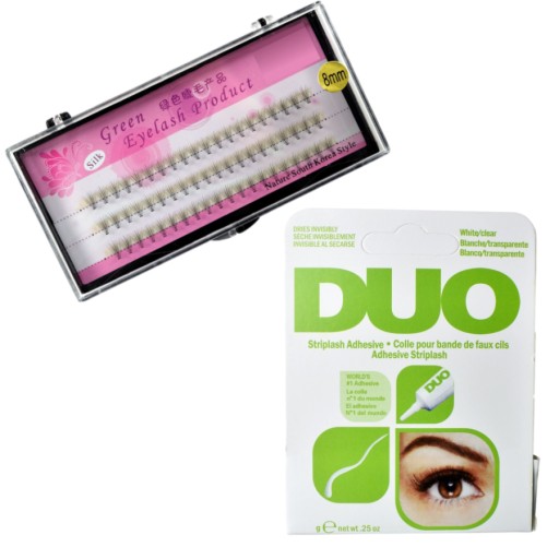 Zestaw zawierający rzęsy jedwabne kępki dł 8 mm, gr 0,1 mm, profil C oraz klej do rzęs Duo Eyelash Adhesive Clear 9g
