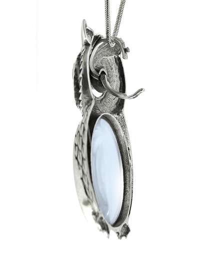 Srebrny naszyjnik lupa w kształcie sowy na łańcuszku.