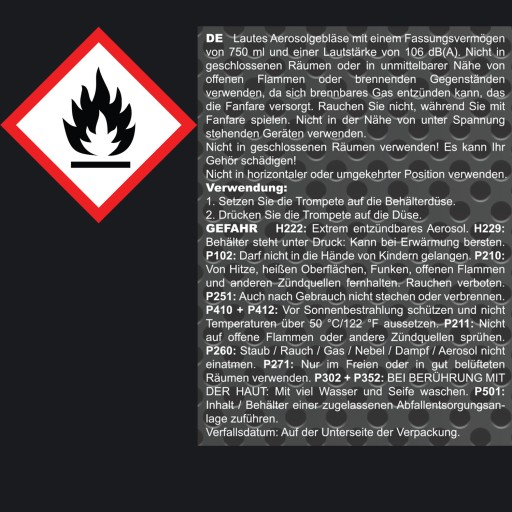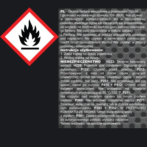 - W trakcie ciągłego używania fanfary pojemnik może się ochładzać, co spowoduje zmniejszenie głośności wydobywanego dźwięku. Należy wtedy przerwać użytkowanie i odczekać chwile, aby ciśnienie gazu w opakowaniu wyrównało się do odpowiedniego stanu.