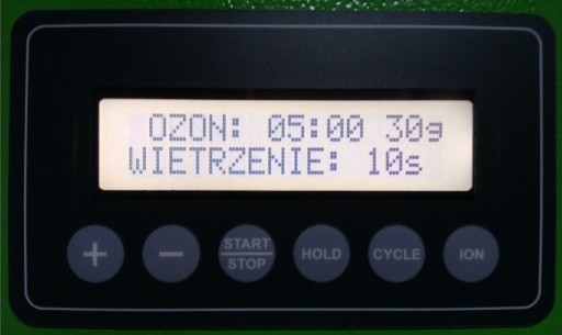 Ozonator wyposażony jest w wyświetlacz alfanumeryczny (2 wiersze po 16 znaków) i klawiaturę (sterowanie pracą generatora ozonu i jonizatora).