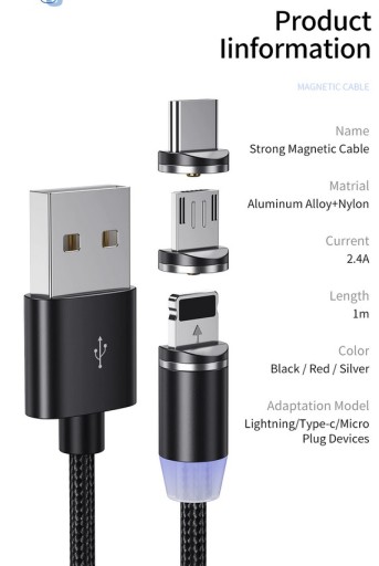 - Końcówka magnetyczna: USB-C, Micro USB, Lightning