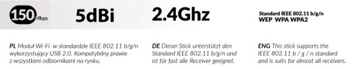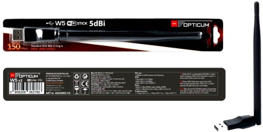 Adapter Wi-Fi USB W5 V2 o zysku energetycznym 5dBi standardzie 802.11n z anteną 15cm, ultra szybka karta sieciowa pracująca w technologii N. Zoptymalizowana architektura transmisji radiowej oraz poprawiony algorytm pasma, daje Tobie ekstremalną wydajność. Już dziś możesz sprawić że Twoja sieć stanie się nawet 3 krotnie szybsza. Adapter jest zgodny z najnowszym standardem 802.11n, dzięki czemu zapewnia lepszą stabilność oraz transfer danych do 150Mb/s. Ponadto jest kompatybilny z poprzednimi standardami (802.11 b/g). Podstawową zaletą tego urządzenia, jest pełna kompatybilność z urządzeniami Opticum oraz tunerami na Linuxie. Może również pracować jako karta sieciowa w komputerach bez WiFi.