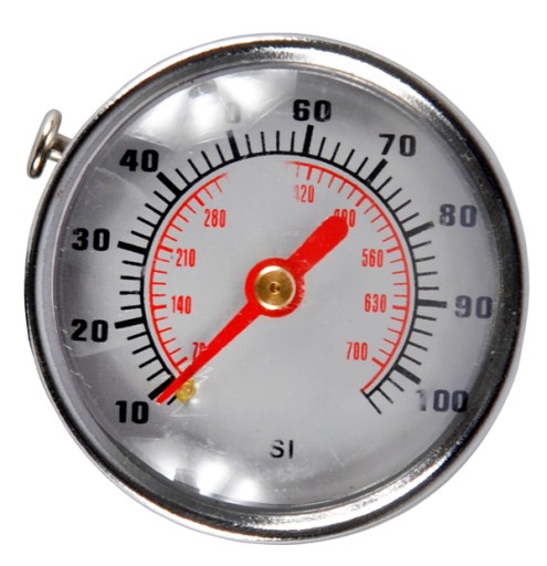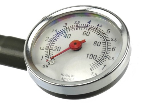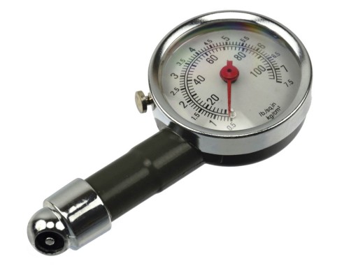 Ciśnieniomierz do kół z manometrem wyskalowanym w dwóch jednostkach Kg/cm2(at) oraz lbs/in2.