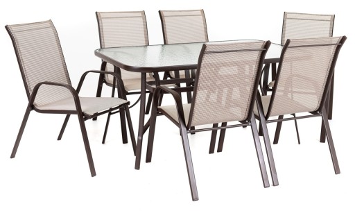 ZESTAW MEBLI OGRODOWYCH idealny do Twojego ogrodu. Stelaż został podwójnie lakierowany proszkowo, co idealnie przystosowuje ten produkt to zastosowania wewnątrz jak i na zewnątrz. Siedzisko krzesła oraz oparcie zostało zrobione z jasno brązowego, elastycznego obicia tekstylnego tak, aby maksymalnie zwiększyć wygodę. Posiada ono dwa oparcia boczne. Użyte materiały nie wymagają częstej konserwacji, są odporne na warunki pogodowe i nie wymagają specjalnych środków do pielęgnacji. Nóżki są dodatkowo zaopatrzone w nakładki z tworzywa sztucznego.Stół posiada blat z przezroczystej hartowanej szyby o gr. 5 mm, z otworem na wstawienie parasola ogrodowego.