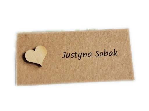 Winietka wykonana jest z papieru ekologicznego w kolorze brązowo - szarym o gramaturze 250g/m2. Ozdabia ją drewniane serduszko.