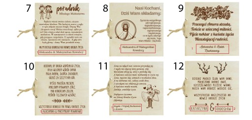 Zachęcamy do przesłania wszystkich informacji bezpośrednio po złożeniu zamówienia w polu "Dodaj wiadomość do Unique_gifts" - okienko tekstowe na dole strony pod opcjami dostawy. Wybranie tej formy komunikacji przyspiesza znacznie czas realizacji zamówienia. Możesz też oczywiście przesłać te informacje mailowo lub poprzez "Pytanie do sprzedającego". Nie ma potrzeby wysyłać dwa razy tych samych informacji.