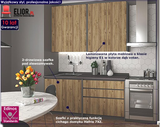 Komplet mebli kuchennych Trida marki Elior nie tylko kompleksowo i funkcjonalnie wyposaży to bez wątpienia najważniejsze pomieszczenie Twojego wnętrza, ale będzie także doskonale spełniać funkcję dekoracyjną. Zestaw Trida świetnie sprawdza się nawet w niewielkiej kuchni lub aneksie kuchennym w kawalerce, nie przytłaczając jej swym rozmachem. Surowa, minimalistyczna kolorystyka nadaje wnętrzu wyrafinowanego stylu i "przemysłowego" charakteru. Meble Trida to efektowna kombinacja frontów w niebanalnym kolorze dąb votan z intrygującym i wyrafinowanym korpusem i blatem o wybarwieniu antracyt. To nieszablonowe połączenie tworzy luksusowe, odważne wnętrze, przyciągające spojrzenia odwiedzających Cię rodziny i przyjaciół.