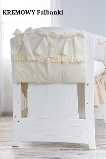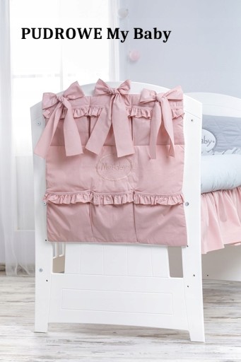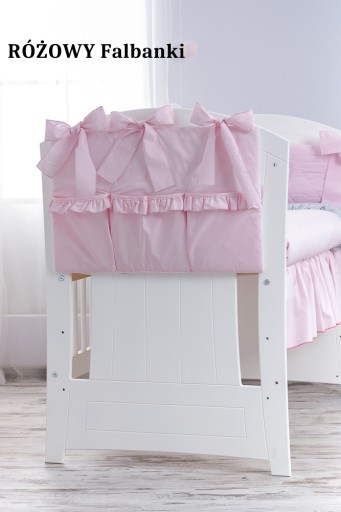 Jest uszyty tak, by móc go łatwo zamocować na ramie łóżeczka - służą do tego ozdobne wiązania. Dzięki nim przybornik na łóżeczko można łatwo zdjąć lub zawiesić w innym miejscu