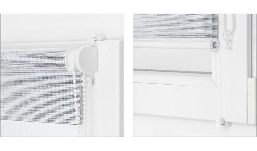 - Napięcie boczne żyłkowe przytrzymuje roletę blisko szyby nawet przy uchylonym oknie oraz zapewnia idealne zwijanie tkaniny na rurkę nawojową