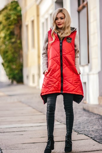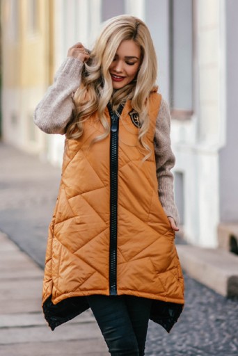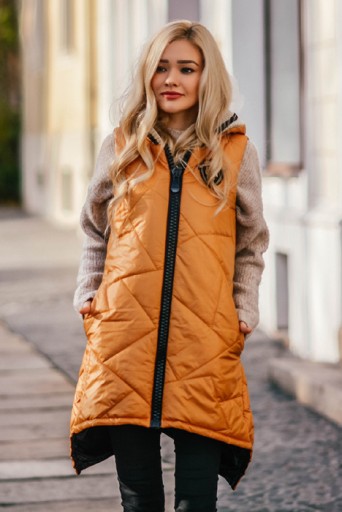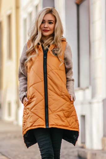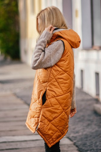 Długa pikowana kamizelka zapinana na gruby suwak z kapturem i dłuższym tyłem, Dwie kieszeni, ozdobna naszywka.