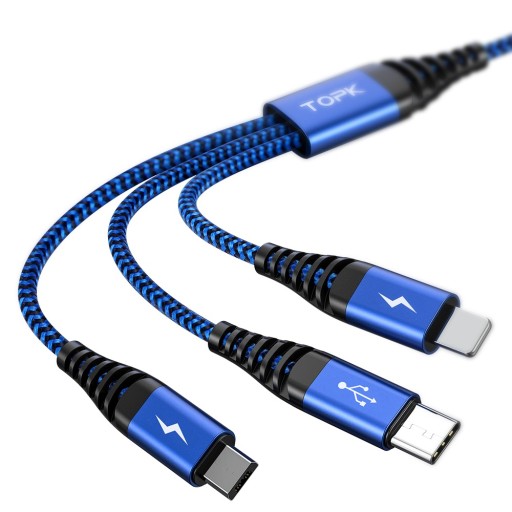 KABEL USB 3w1 na USB TOPK AN24 micro USB / iPhone / USB C, dł. 1,2 metra, oplot, szybkie ładowanie, transmisja danych transmisją danych*, 3A, 120cm