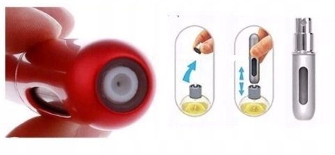 Aby napełnić atomizer, zdejmij zatyczkę - sprej z perfum i widoczną rurkę włóż do otworu z dołu atomizera. Teraz kilkukrotnie napompuj - tak jak używasz perfum - i gotowe! W kilka ruchów atomizer będzie wypełniony Twoim ulubionym zapachem!