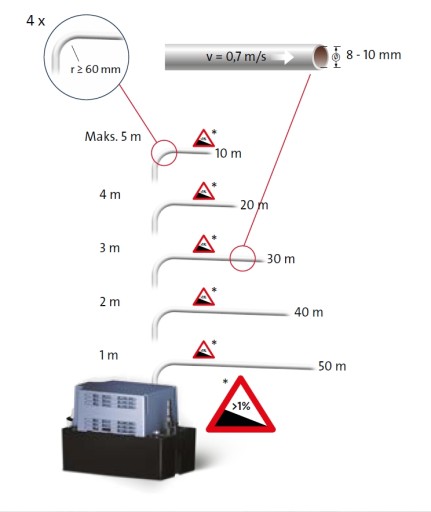 Na ostatnim foto widać jak powiązane są ze sobą wysokość podnoszenia i odległość piec-pion kanalizacyjny. Podana tam w górnym lewym rogu wartość 4 - to informacja, że dopuszczalne są 4 wygięcia rury, każde o promieniu nie mniejszym niż 60 mm.