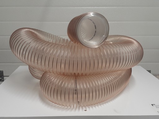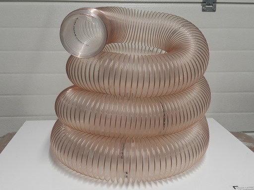 Wąż do odpylania PU Flex fi 250 bardzo lekki i elastyczny. Wąż antystatyczny PU fi 250 do pracy w przemyśle drzewnym, chemicznym i tworzyw sztucznych, do transportu lekkich substancji stałych, a także do powietrza i gazu. Elastyczny wąż wyciągowy PUR fi 250 do trocin i odpylania z dobrą rozciągliwością i dużą odpornością na ścieranie. Wąż do CNC 250