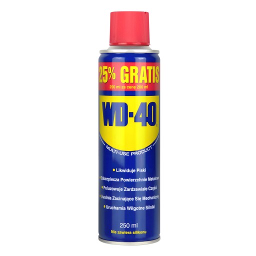 WD - 40 to wielofunkcyjny preparat, który: czyści i konserwuje, likwiduje skrzypienie i piski, usuwa wodę, poluzowuje zardzewiałe części, uwalnia zacinające się mechanizmy, zabezpiecza metalowe powierzchnie przed korozją. Nie zawiera silikonu.