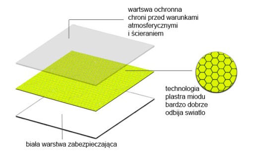 Jakość: wysokiej jakości wydruk, plastry miodu, odblask usztywniany, neonowy