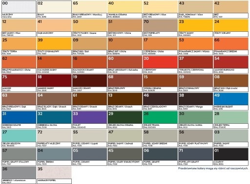 - kolory standardowe: czarny, biały, popiele, brązy, drewnopodobne, łącznie 10 kolorów do wyboru