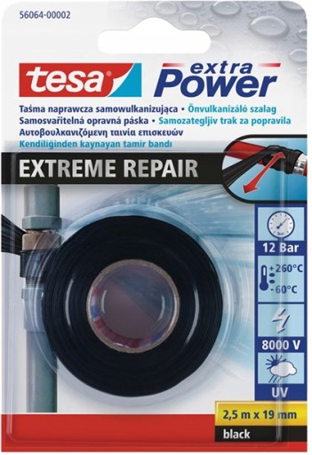 Samoprzylepna taśma samowulkanizująca TESA 56064 przeznaczona jest do bieżących napraw i uszczelnień. Taśma tworzy natychmiastowe hermetyczne uszczelnienie. Ze względu na silikonowy nośnik taśma charakteryzuje się doskonałą odpornością na wiele chemicznych substancji np. oleje, kwasy, rozpuszczalniki, słoną wodą, promieniowanie UV i skrajne temperatury. Zachowuje właściwości w temperaturach od -60°C do +260°C. Taśma jest elastyczna i może być stosowana na każdym rodzaju powierzchni, włączając powierzchnie wilgotne, ciepłe, brudne czy tłuste. Doskonałe sprawdzi się podczas napraw-uszczelnień rur, izolacji przewodów, pracach elektrycznych (Nie przewodzi prądu), sanitarnych, ogrodowych, hobbystycznych i innych. Poniżej przykład zastosowania taśmy samowulkanizującej TESA