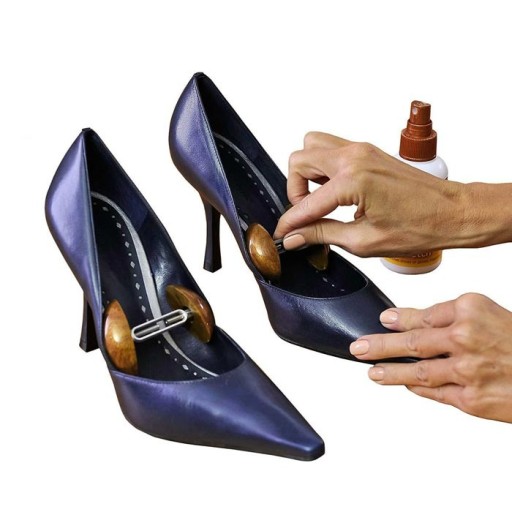 - Drugi sposób polega na rozpyleniu płynu i włożeniu ekspanderów Stretch Genie w celu stopniowego rozciągania butów w celu uzyskania preferowanego rozmiaru.