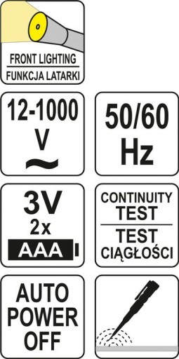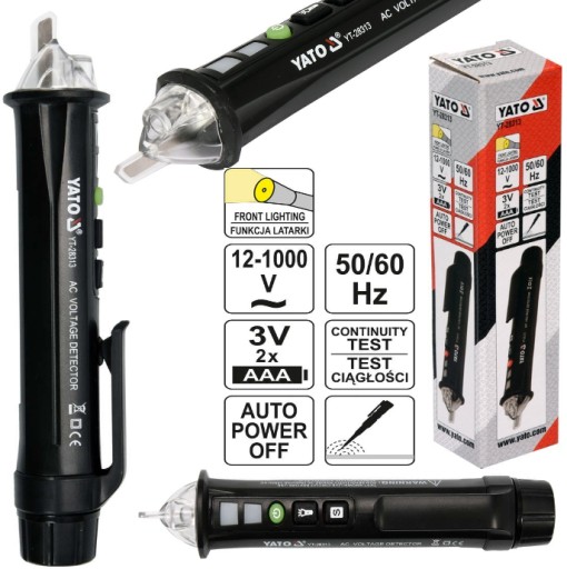 Indukcyjny próbnik napięcia YT-28313 marki YATO. Przeznaczony do wykrywania napięcia w przewodach elektrycznych. Działając na zasadzie indukcji, bezdotykowo wskazuje czy przewody są pod napięciem. • 2-zakresowy test indukcyjny: 12-1000 V oraz 48-1000 V • sygnalizacja wykrytego napięcia w przewodach za pomocą diody LED i sygnału dźwiękowego • eliminacja bezpośredniego kontaktu grotu z odizolowanym przewodem zwiększa bezpieczeństwo użytkowania i przyspiesza pracę • regulacja czułości umożliwia wykrycie przewodów pod napięciem także w ścianach • test ciągłości • funkcja automatycznego wyłączania • funkcja latarki • obudowa odporna na uderzenia i upadek z wysokości 2 m • w zestawie 2 baterie AAA 3 V.