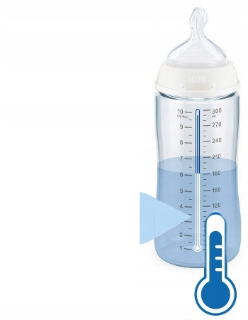 Aby mieć pewność, że pokarm podawany nie będzie zbyt gorący, butelka NUK First Choice+ posiada wskaźnik temperatury Nuk. Wskaźnik wygląda jak termometr i jest umieszczony pomiędzy kreskami podziałki. Wskaźnik zmienia kolor pod wpływem zmiany temperatury zawartości butelki.