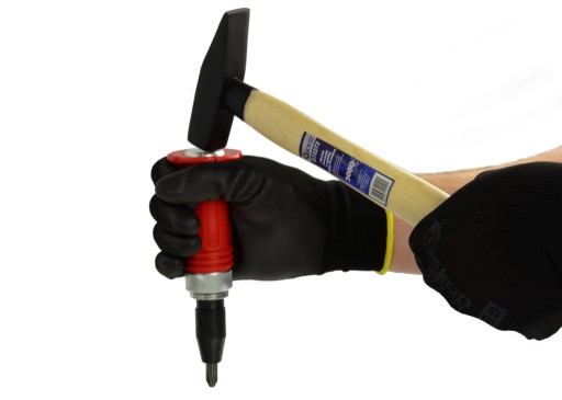Wkrętak udarowy dzięki możliwości zamontowania na nim każdej nasadki na 1/2" staje się narzędziem przydatnym w każdym profesjonalnym warsztacie, ale również w przydomowym garażu. Metalowy trzpień zabezpieczony jest gumą zakończoną kołnierzem, który chroni naszą dłoń przed bolesnym uderzeniem młotkiem.