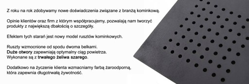 Trwały, solidnie wykonany ruszt idealny do każdego pieca, kominka. Wspomaga ciąg i zapewnia prawidłowy przepływ powietrza podczas spalania opału.