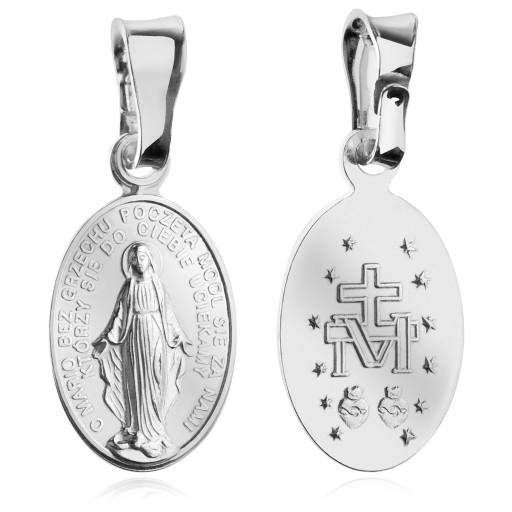 Medalik z przepięknym wizerunkiem Matki Boskiej Niepokalanej. Z przodu medalika grawer z modlitwą : '' O matko bez grzechu poczęta módl się za nami którzy się do ciebie uciekamy '' .