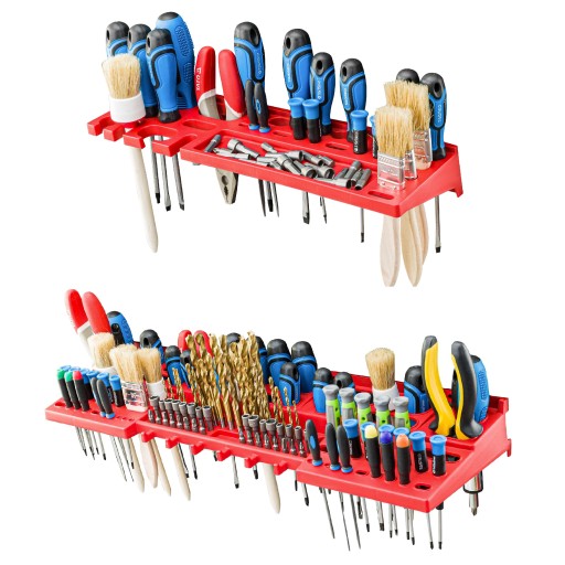 Świetny dodatek stanowią wytrzymałe uchwyty i półki narzędziowe pomagające przechowywać dłuższe narzędzia tj. młotek, wiertła, klucze, śrubokręt czy kombinerki. Dzięki uchwytom najważniejsze narzędzia będą zawsze pod ręką i zajmą znacznie mniej miejsca w warsztacie. Praktyczne oraz świetnie wyglądające rozwiązanie.