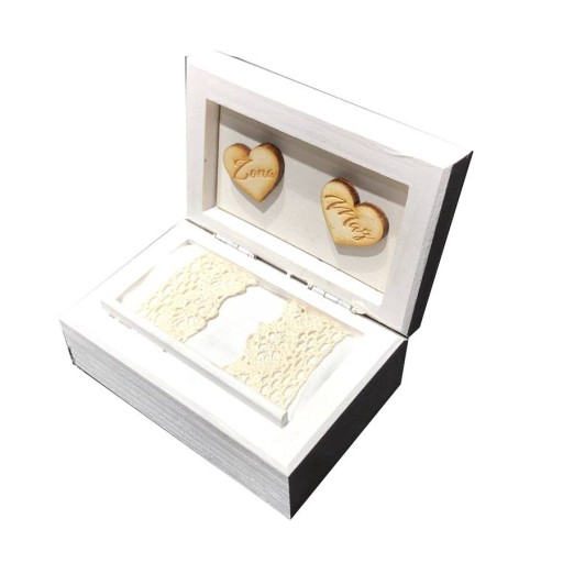 Przeurocze pudełko ślubne z poduszeczkami kokardką ażurową w stylu rustykalnym. Szkatułka pozwoli pięknie podać obrączki na ceremonii ślubnej.
