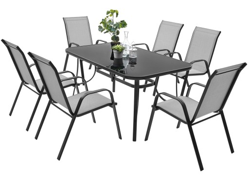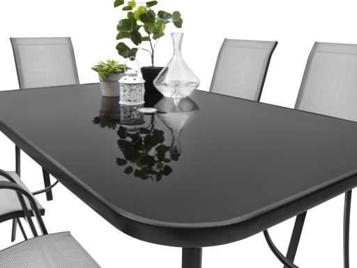 ZESTAW MEBLI OGRODOWYCH idealny do Twojego ogrodu. Stelaż został podwójnie lakierowany proszkowo, co idealnie przystosowuje ten produkt to zastosowania wewnątrz jak i na zewnątrz. Siedzisko krzesła oraz oparcie zostało zrobione z jasno szarego, elastycznego obicia tekstylnego tak, aby maksymalnie zwiększyć wygodę. Posiada ono dwa oparcia boczne. Użyte materiały nie wymagają częstej konserwacji, są odporne na warunki pogodowe i nie wymagają specjalnych środków do pielęgnacji. Nóżki są dodatkowo zaopatrzone w nakładki z tworzywa sztucznego..Stół posiada blat z czarnej hartowanej szyby o gr. 5 mm, z otworem na wstawienie parasola ogrodowego.