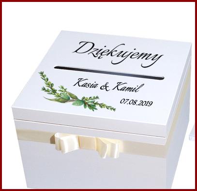 Na wieku napis Dziekujemy ( dekor lakierowany w kolorze złotym), pudełko w około przepasane wstązka z kokardą