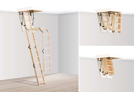 -klapa po otwarciu chowa się w skrzyni dzięki temu schody można montować bezpośrednio przy ścianie.