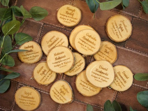 Plastry drewna wykorzystane do produkcji gadżetów reklamowych, upominków ślubnych.