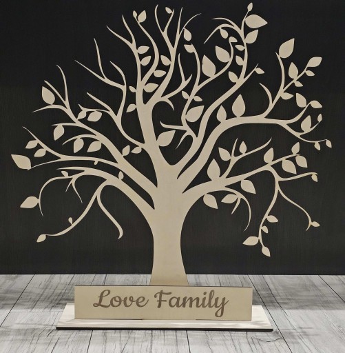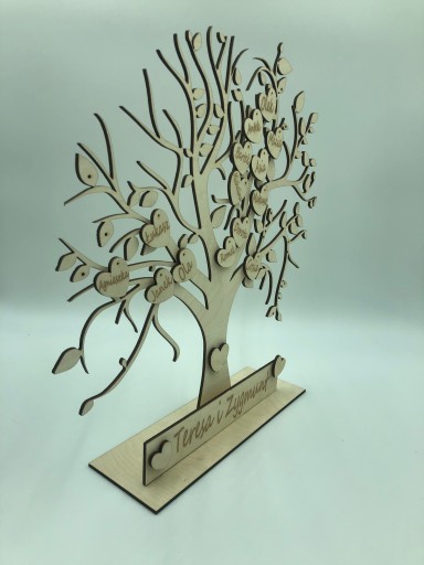 Rodzinne drzewo genealogiczne wykonane z sklejki brzozowej 5 mm o wysokości 45 cm, z podstawą i tabliczką z grawerem do samodzielnego montażu.
