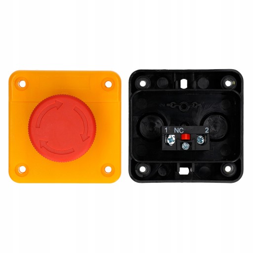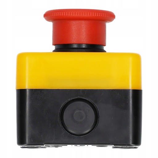 Awaryjny przycisk bezpieczeństwa załączany poprzez bezpośrednie wciśnięcie grzybka, odryglowywany poprzez obrót.