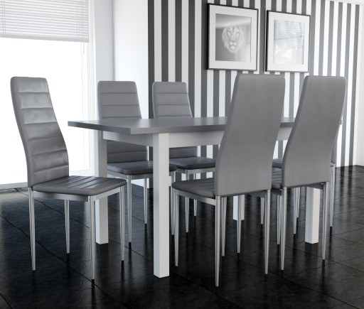 Konstrukcja krzesła wykonana ze stali chromowanej. Tapicerka użyta na krzesła to najwyższej jakości eko skóra lub szary welur. Wykonanie nadaje mu nowoczesności i sprzyja utrzymaniu w czystości. Nogi mają zabezpieczenia przed uszkodzeniem paneli podłogowych, powierzchni lakierowanych, podłóg ceramicznych.